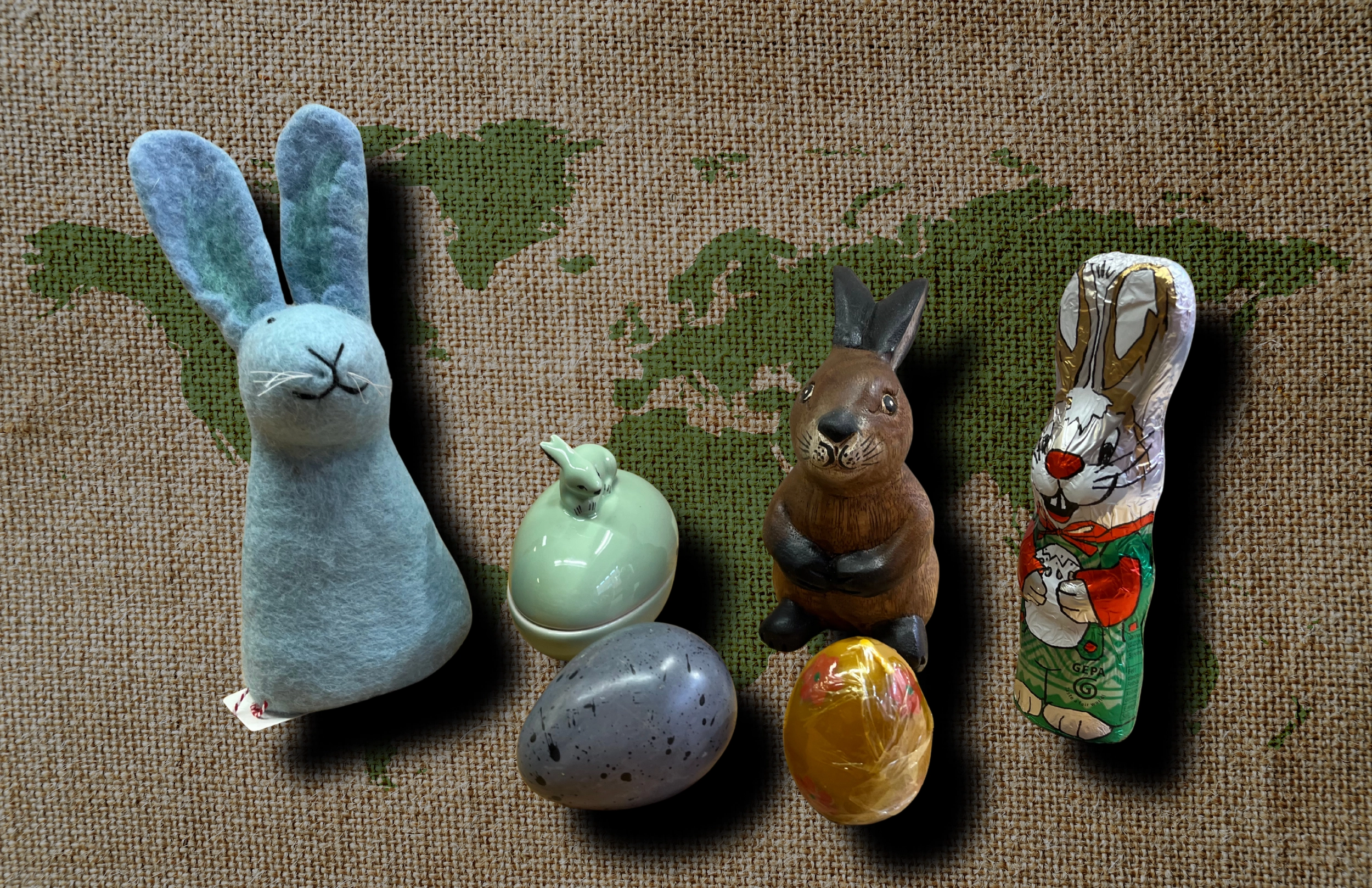 Osterhasen aus Filz, Holz oder Schokoladen. Ostereier aus Speckstein oder als Kerze. Fertige Oster-Geschenkkörbe. Und vieles mehr, alles aus fairem Handel.